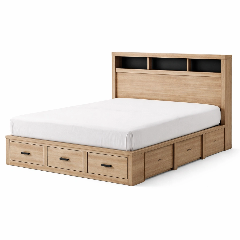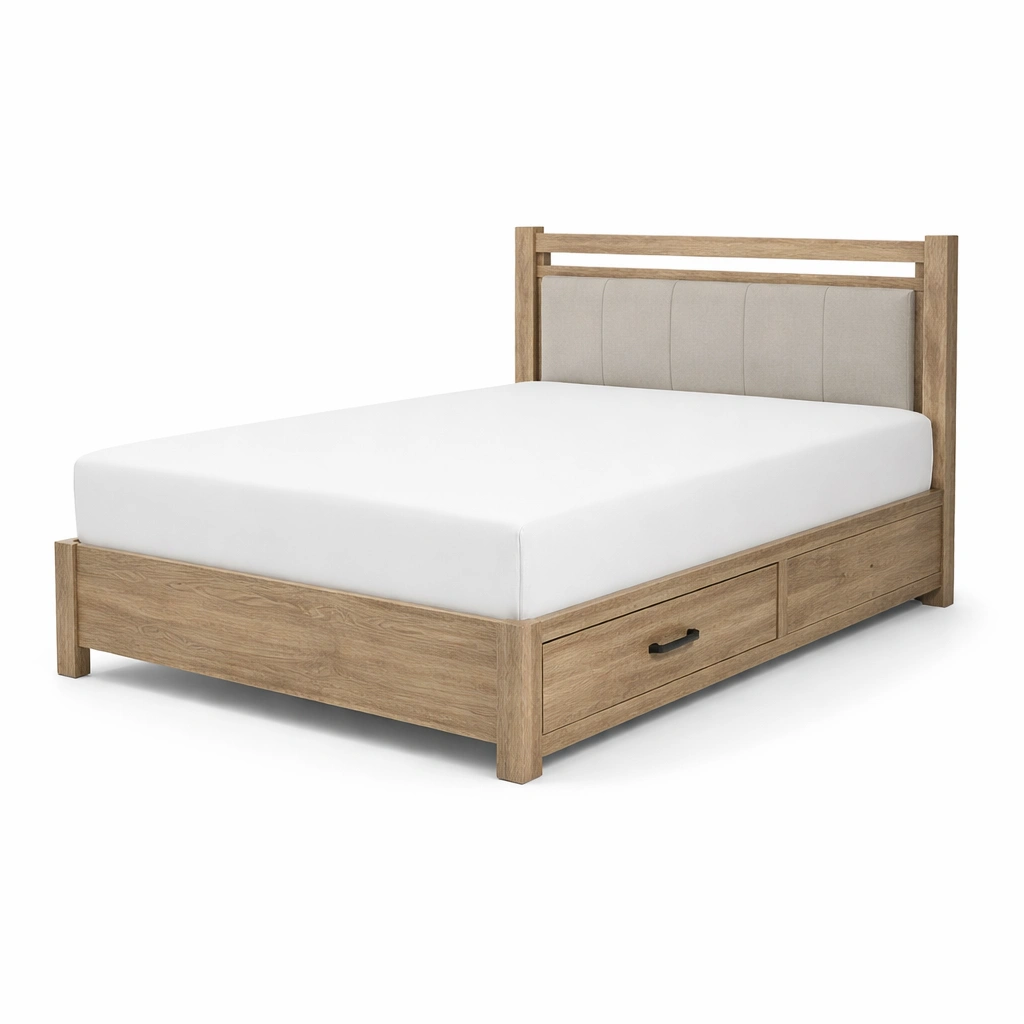 Cama con almacenamiento de madera con cabecero tapizado y cajones