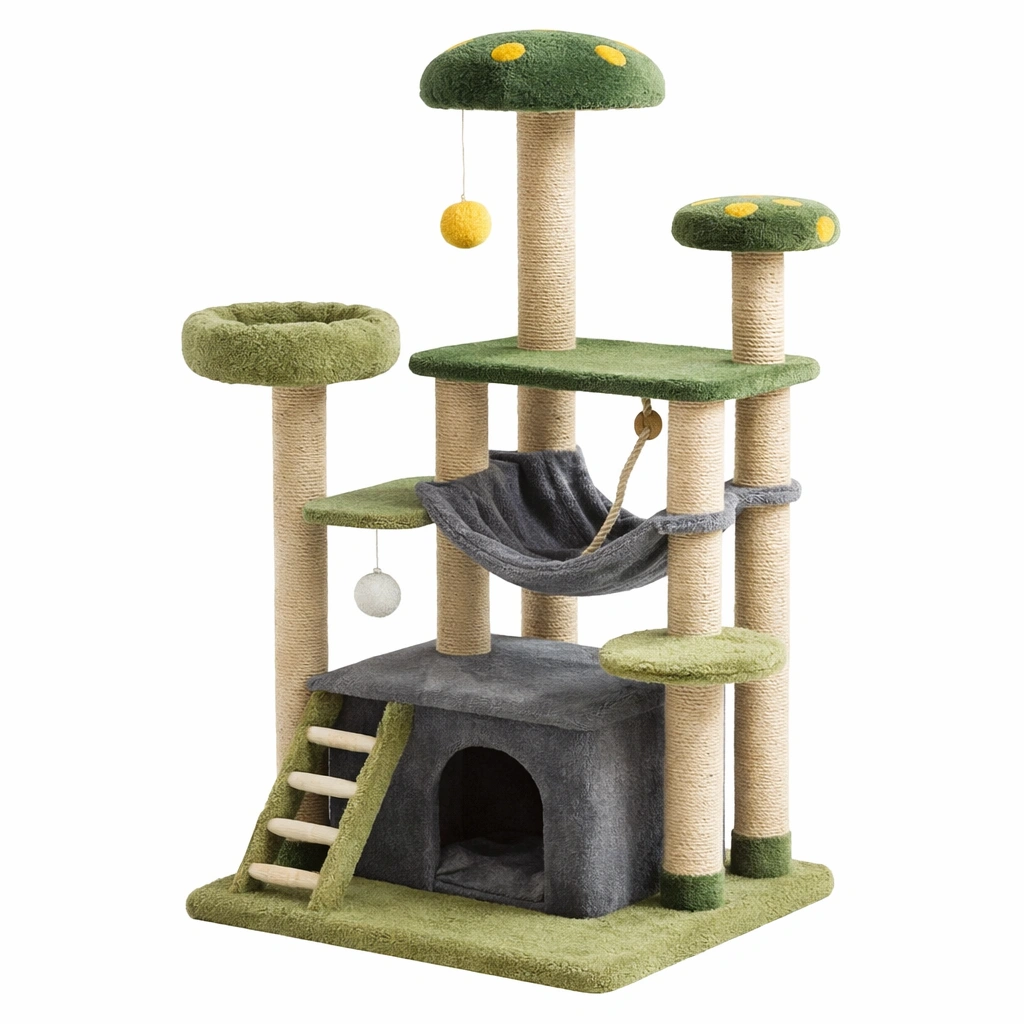 Árbol para gatos multinivel con estructura de madera y recubrimiento de felpa sintética. Los postes están cubiertos de cuerda de sisal, ideal para rascar. Incluye varias plataformas, una hamaca de tejido de poliéster y una cueva tapizada.