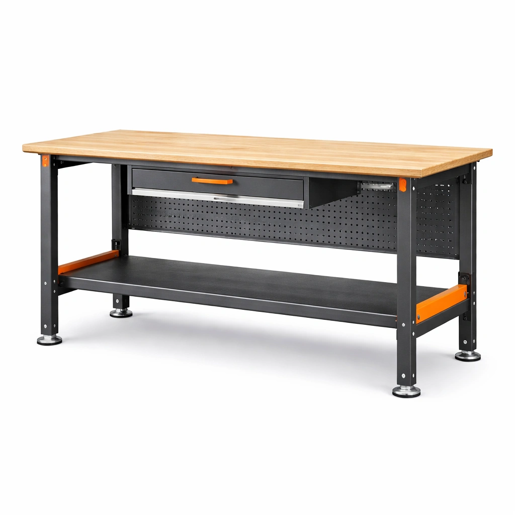 Mesa de trabajo diseñada para uso en interiores. Ofrece un amplio espacio de trabajo y almacenamiento.