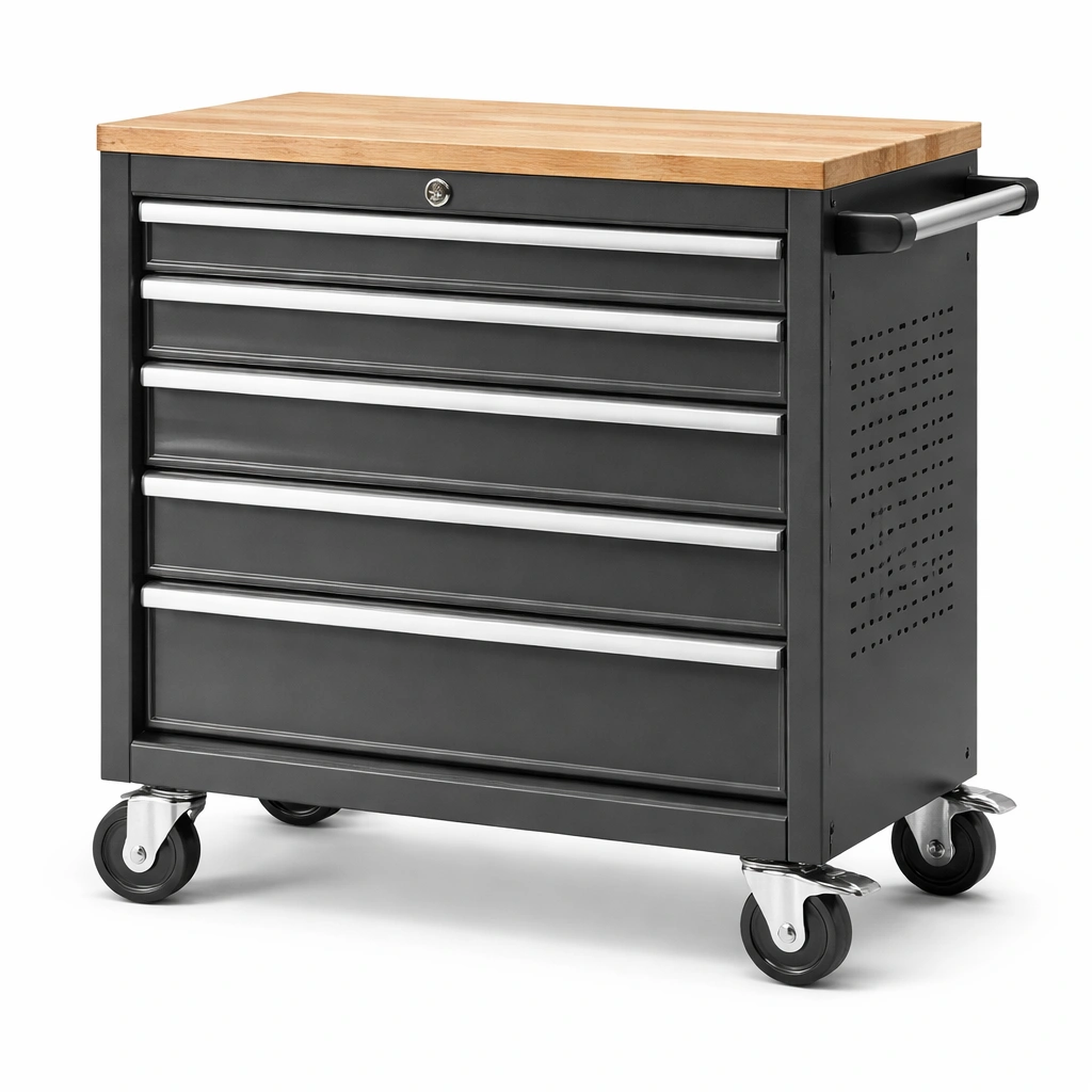 Características técnicas:5 cajonesCapacidad de carga: 50 kgRuedas de cauchoAsas metálicasBloqueo incluido